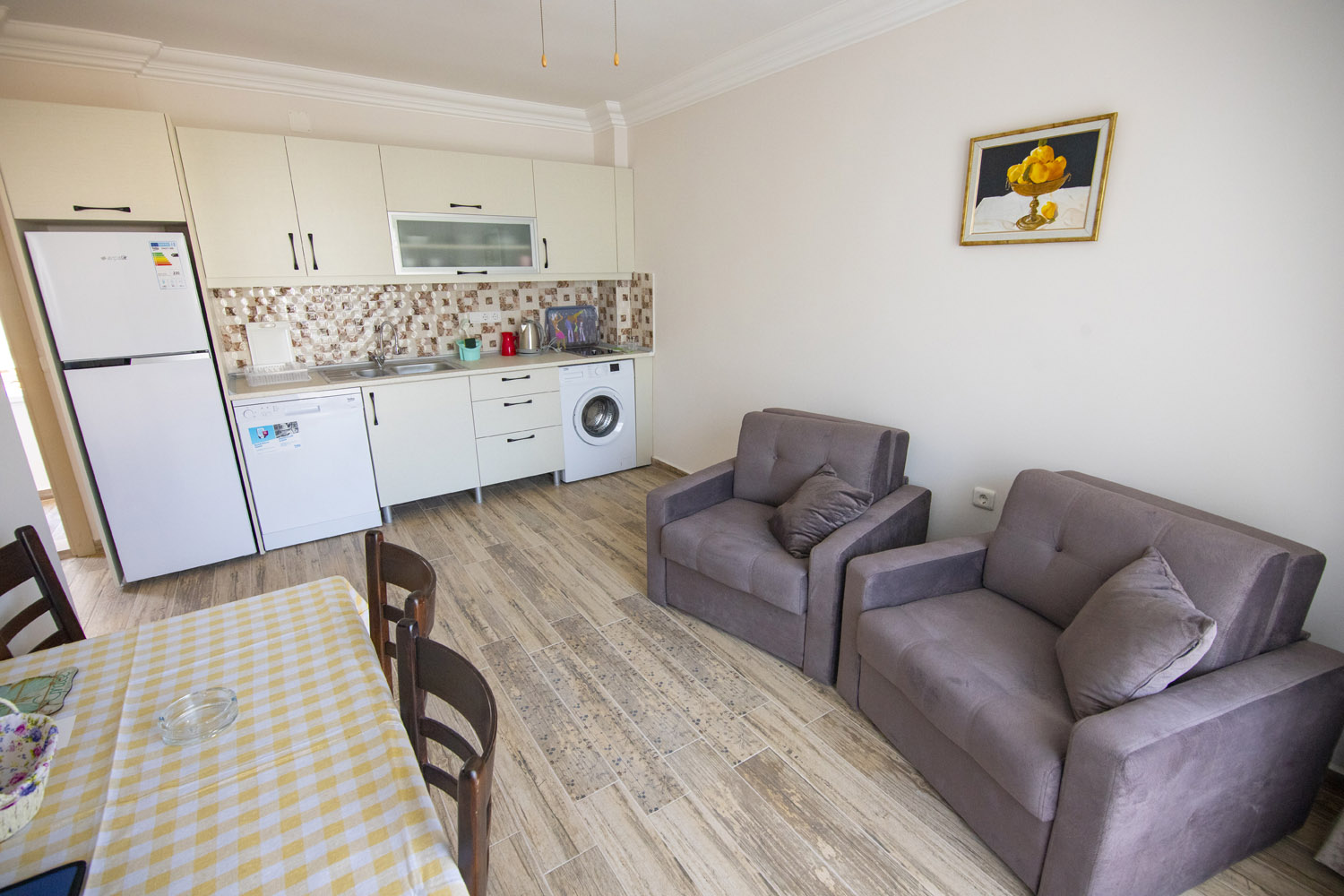 Our 37.5 m² 1+1 Apartments, Accommodation in the comfort of home in Marmaris Turunc designed to offer. Apartments; 1 bedroom, 1 living room and fully equipped kitchen is formed.